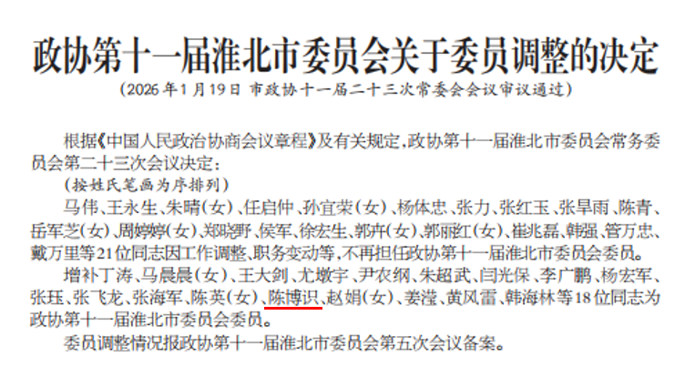 1月19日,經(jīng)淮北市政協(xié)十一屆二十三次常委會會議審議通過,我院英語教研室教師、九三學(xué)社社員陳博識增補(bǔ)為政協(xié)第十一屆淮北市委員會委員。
