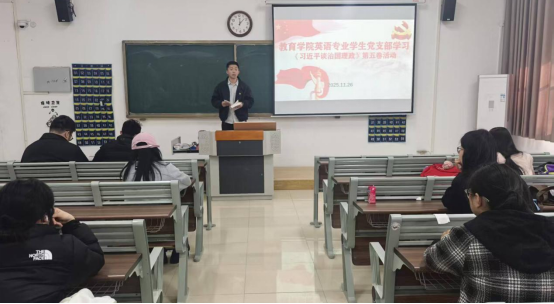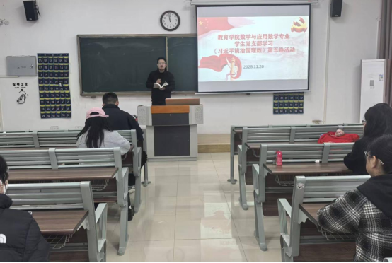 為引導(dǎo)入黨積極分子深入學(xué)習(xí)習(xí)近平新時(shí)代中國特色社會(huì)主義思想,不斷提升個(gè)人政治素養(yǎng)與思想覺悟。教育學(xué)院數(shù)學(xué)與應(yīng)用數(shù)學(xué)專業(yè)、英語專業(yè)學(xué)生黨支部于11月26日在1號(hào)教學(xué)樓116教室聯(lián)合組織開展學(xué)習(xí)“《習(xí)近平談治國理政》第五卷”活動(dòng)。