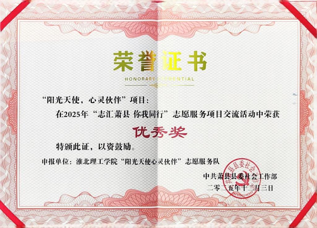 近日,由蕭縣縣委社會(huì)工作部主辦的2025年“志匯蕭縣·你我同行”志愿服務(wù)項(xiàng)目交流活動(dòng)圓滿(mǎn)落幕。在劉暢老師的悉心指導(dǎo)下,淮北理工學(xué)院教育學(xué)院“陽(yáng)光天使,心靈伙伴”志愿服務(wù)團(tuán)隊(duì)?wèi){借專(zhuān)業(yè)的服務(wù)理念、扎實(shí)的實(shí)踐成效脫穎而出,榮獲活動(dòng)優(yōu)秀獎(jiǎng),為蕭縣志愿服務(wù)事業(yè)增添了溫暖底色。